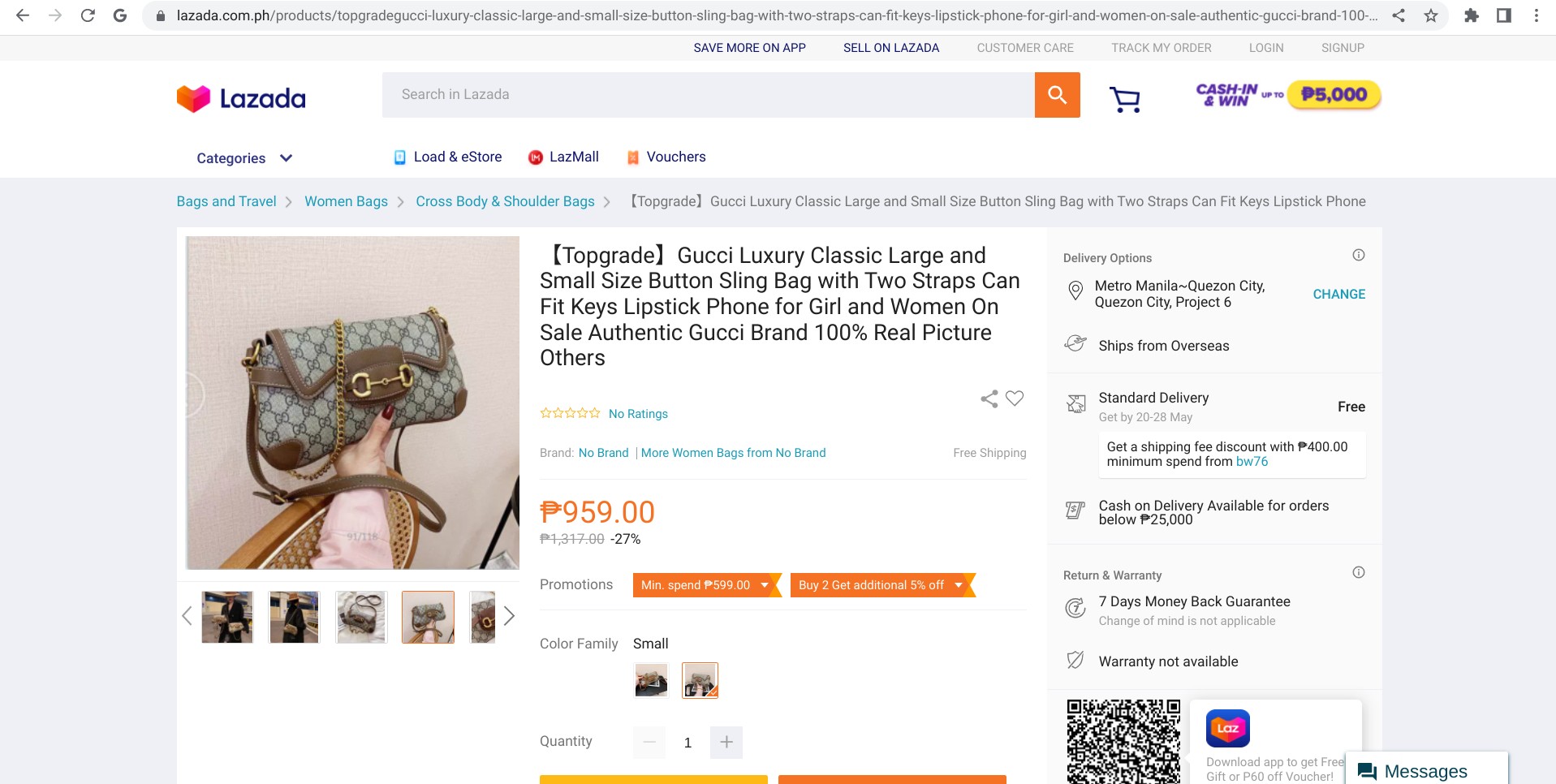 Der Screenshot unten zeigt zum Beispiel ein Angebot für eine angeblich 100% authentische Gucci-Tasche zum Preis von 959 philippinischen Pesos (ca. 18 Euro). Wir haben dieses Produkt zwar noch nicht testweise gekauft, können uns also nicht zweifellos sicher sein, aber so, wie es aussieht, scheint es sich hierbei nicht um ein Original zu handeln.