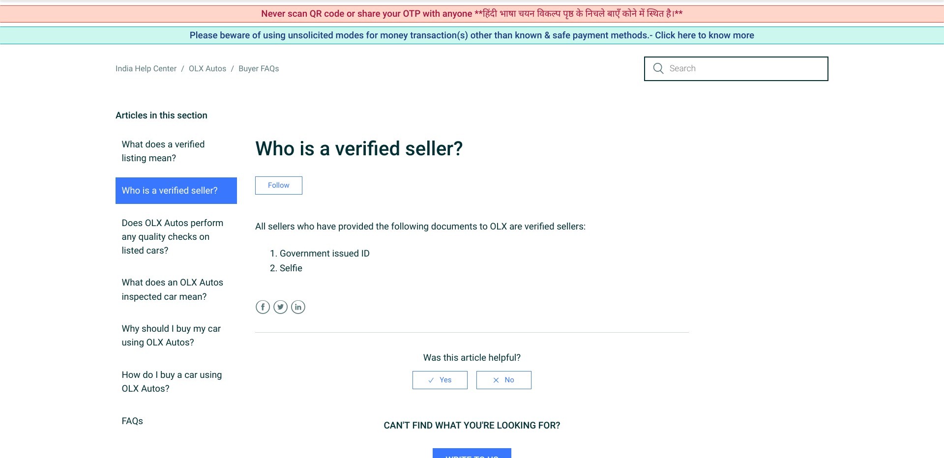 OLX prüft seine Verkäufer ebenfalls, allerdings scheint das Verfahren nicht sehr streng zu sein. In der Tat ist alles, was OLX von seinen Verkäufern verlangt, ein staatlicher Ausweis zusammen mit einem Selfie. (Ja, auf der offiziellen Website von OLX stand "Selfie")