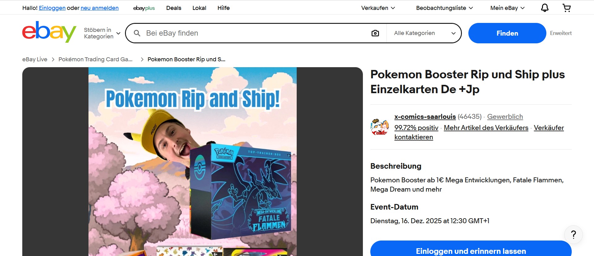 Launched at Comic Con Stuttgart on 29 November 2025, eBay Live is now available to selected German sellers. The first live stream was started directly at the Comic Con, offering Pokémon trading cards. As sellers of such items are often a part of the fan community, eBay Live offers them a chance to establish and strengthen their connections with their customers.