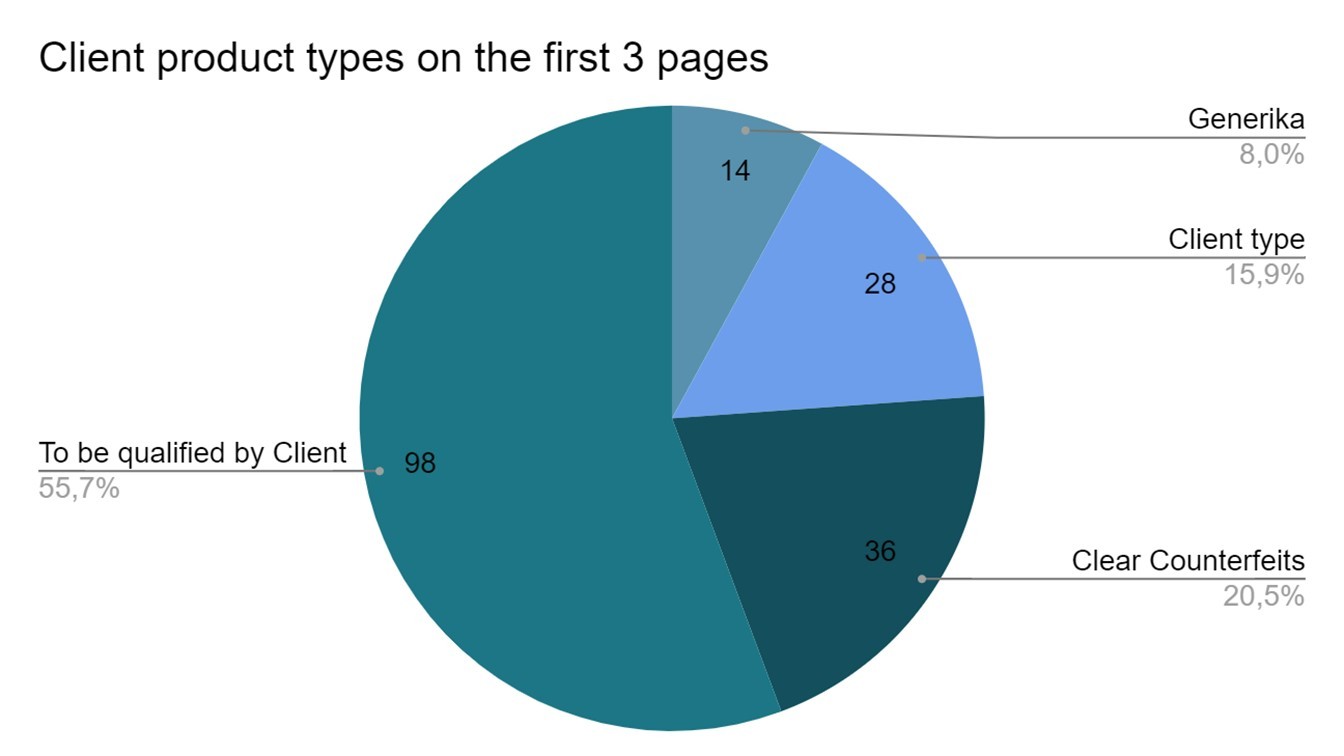 The search results presented us with 8% of generic products (listings where the brand name was used to describe a non-branded product), 15.9% of brand-type products (listings describing a non-branded product as “brand-type”), and 20.5% of counterfeit products.