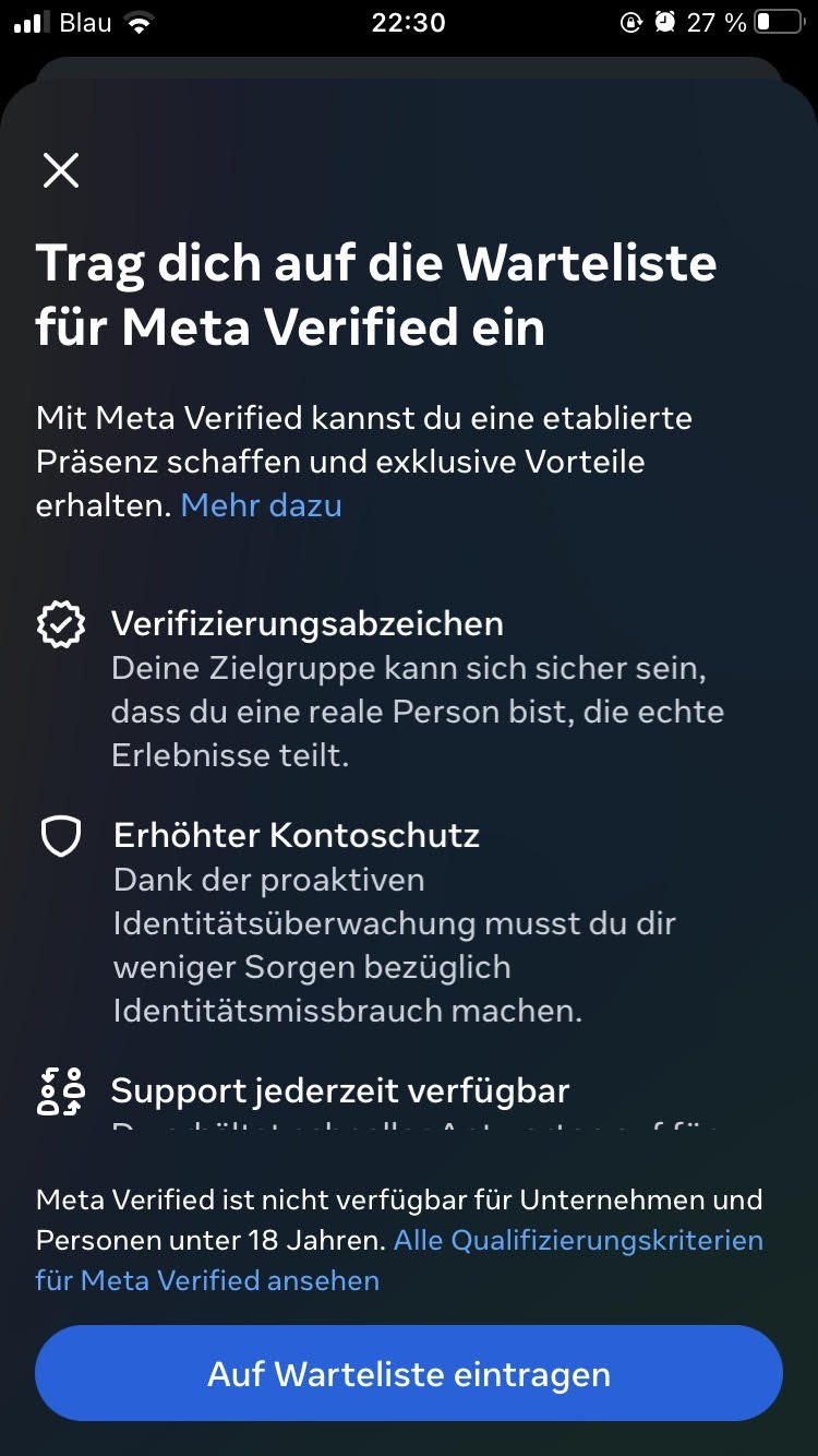 Translation: “Join the waitlist for Meta Verified. With Meta Verified, you can create an established presence and enjoy exclusive benefits. Verification tick: Your target audience can be sure that you’re a real person who shares authentic experiences. Heightened account protection: Thanks to proactive identity monitoring, you are less exposed to identity theft. Support around the clock. Meta Verified is not available to businesses and persons under 18 years old." (translated by globaleyez)