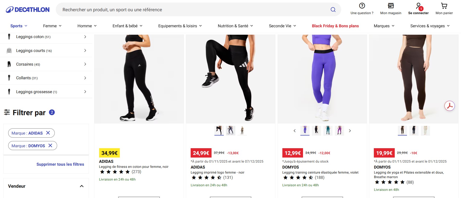 Screenshot of decathlon.fr displaying sports leggings produced by Adidas and DOMYOS