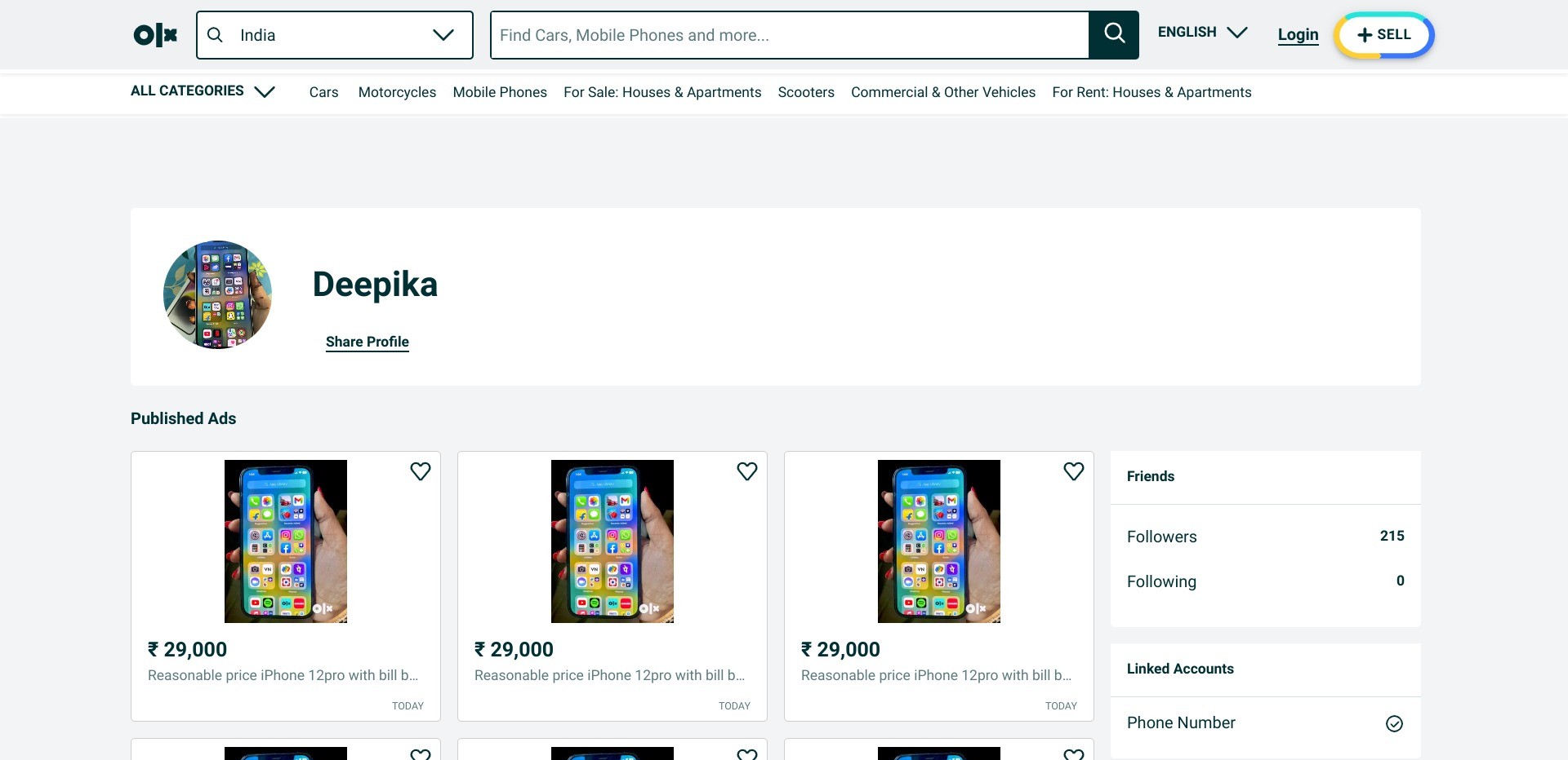 Screenshot of a random seller’s profile page on olx.in